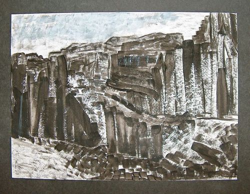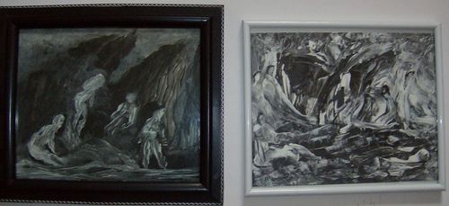 The two middle pieces are acrylics titled "Cave Dwellers."